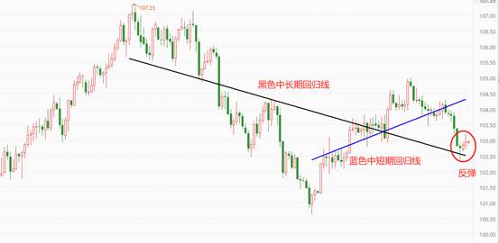 上图为美元指数日线级别走势图。技术角度看,开始于2月14日的下跌波段已经与中长期回归线重合,昨日收盘后重合部分确定形成底分形支撑结构,后市看涨。以中短期回归线的指向来看,本轮反弹可能会使得美元指数重新站上104关口。如果宏观经济环境配合,美指甚至可能刷新2月份新高。需要提醒的是,目前市场的主流预期仍然是“美联储将提前降息”,所以美指短期反弹结束后继续下破中长期的回归线的可能性仍然存在。