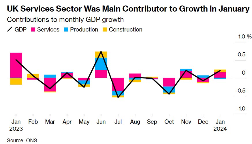 周三公布的英国最新经济数据则显示,英国经济在去年下半年陷入技术性衰退后,一月份出现明显反弹,实现小幅增长。继12月份GDP环比下降0.1%后,1月份英国国内生产总值(GDP)环比增长0.2%,符合市场预期。服务业和建筑业带来了收益,抵消了工业生产下降。
