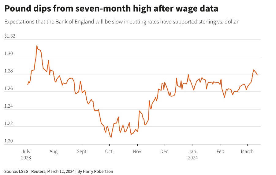 英国周二公布的薪资数据似乎尽最大努力试图将英镑从七个月高位往下拉回,但英国经济仍显示出足够的复苏迹象,令投资者相信英国央行仍需在较长时间内维持高利率不变,并且押注英国央行降息时机晚于美联储和欧洲央行。周二英镑一度跌至1.277美元左右但是此后迅速回升至1.28美元附近。此前数据显示,英国常规工资增幅略低于预期,从之前的6.2%略微降至截至1月份的三个月期的6.1%,使英镑低于上周五超过1.285美元的七个月高点。