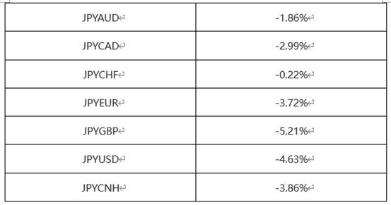 上表为100日元相对其他货币的涨跌幅,周期为年初至今。七个货币对,数值均为负,意味着日元在年初至今的这段时间里呈显出普遍的贬值特征,这与前文所述的“日本尚未摆脱通缩”和“日本央行推迟加息时点”的判断有重要关联。具体数值来看,JPYGBP的跌幅达到5.21%,位居所有货币对首位,英镑成为日元贬值的最大受益者。贬值幅度最小的是JPYCHF,主要是因为瑞士的宏观经济相对稳定,没有出现如美国一般的高通胀问题,所以在过去两年没有出现激进加息,瑞郎的升值预期没有其它货币那么强烈。