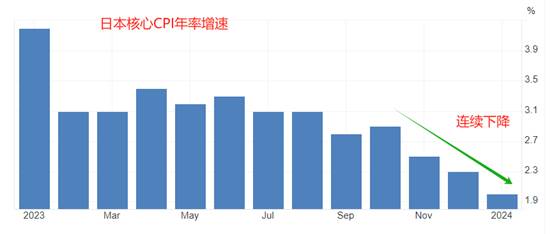 日本1月份的CPI年率2.2%,低于前值2.6%,降幅0.4个百分点,支持“通缩延续”的判断。1月份核心CPI年率2%,低于前值2.3%,降幅0.3个百分点,意味着剔除能源和食品价格的影响后,日本的其它消费品价格也在下降,同样支持“通缩将会延续”的判断。历史数据看,日本的核心CPI已经连续三个月下降,平均每月的降幅都在0.3个百分点。按照该速度计算,日本的核心通胀率将会在2月份跌破2%的目标水平,届时,日本央行加息的可能性将更低。