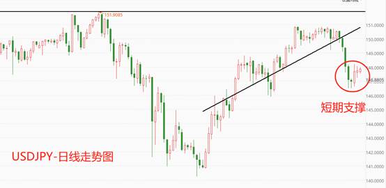 上图为USDJPY的日线走势图。技术角度看,USDJPY处于中长期上涨趋势之中,但涨势并不顺畅,经常出现幅度极大的回调波段。最新一轮回调波段已经出现短期支撑的特征,市价距离黑色回归线也已经有一段距离,后市止跌回升的可能性较高。历史大顶出现在151.90关口,如果本轮反弹能够有效突破该阻力,则未来上涨空间将彻底打开。需要提醒的是,历史高点被突破,往往伴随着经济面的深刻变化。如果未来数周日本央行和日本经济没有超预期的变动,USDJPY向上冲击150整数关口可能再次以失败告终。