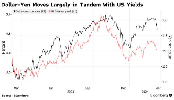 此外,在美国经济走强和通胀胶着的情况下,美债收益率节节攀升,因此2024年伊始,日元兑美元便面临下行压力。这意味着,日元的主要推动力,即日本与全球其他主要市场之间的收益率差距,可能会继续扩大,足以限制日元涨幅。