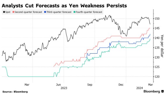 野村证券、瑞穗银行和花旗集团全球市场日本公司等机构最近几周纷纷下调了日元汇率预测。外媒调查的预测中值为2024年末日元兑美元汇率为140,仅比当前水平强5%。