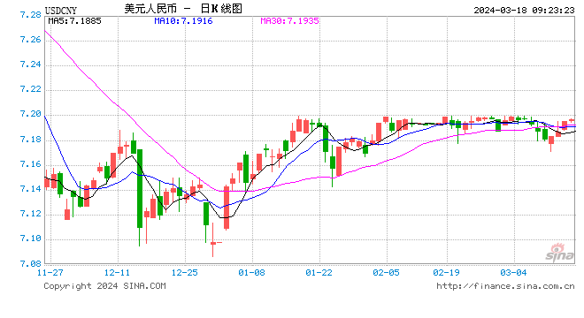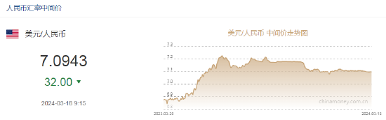 3月18日,人民币中间价报7.0943,上调32点,上一交易日中间价报7.0975。