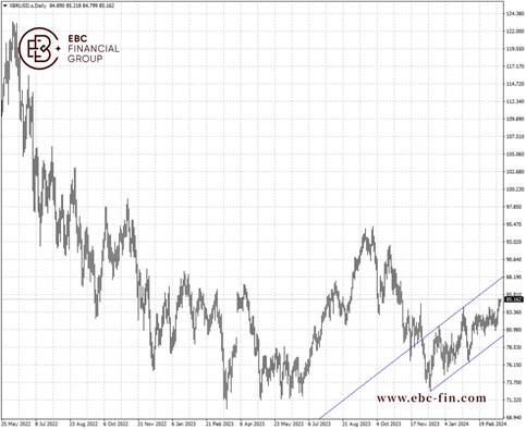 布伦特原油处于去年12月中旬开始的上行通道中,预示良好趋势的延续。下一个阻力区域在87美元附近。