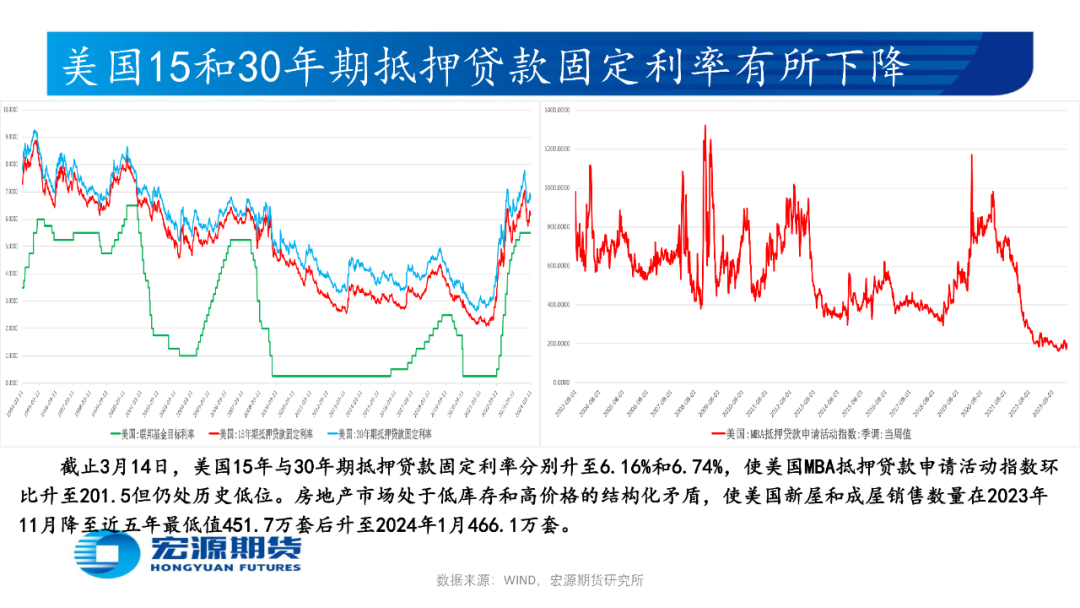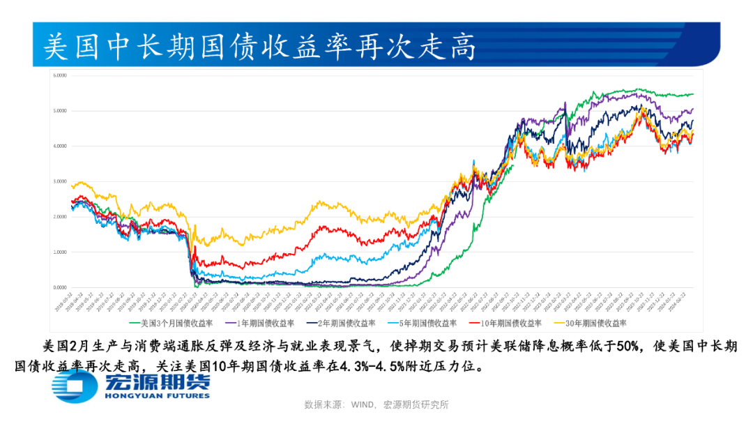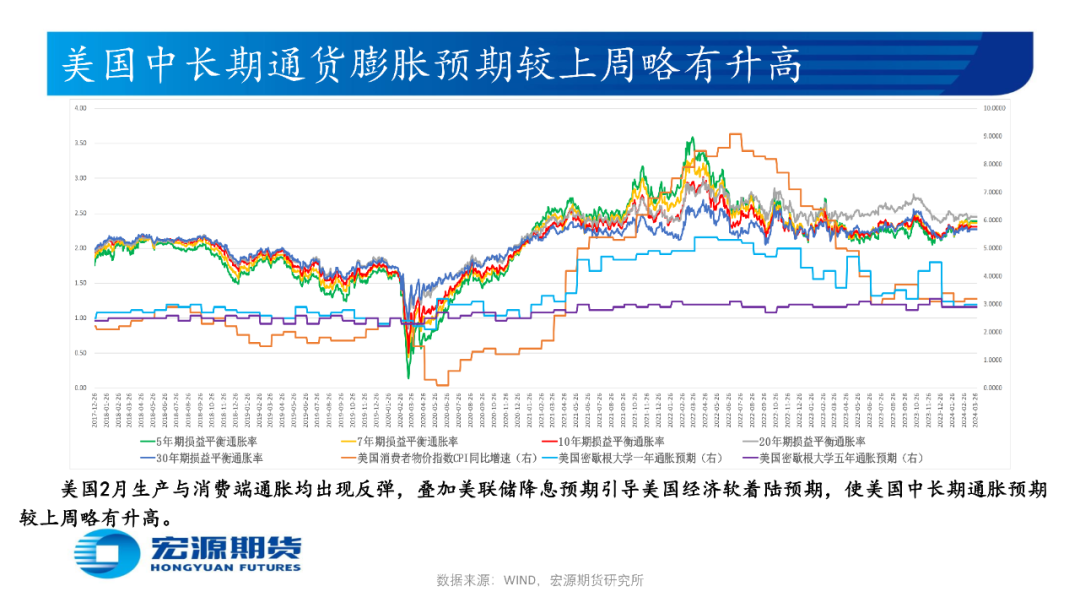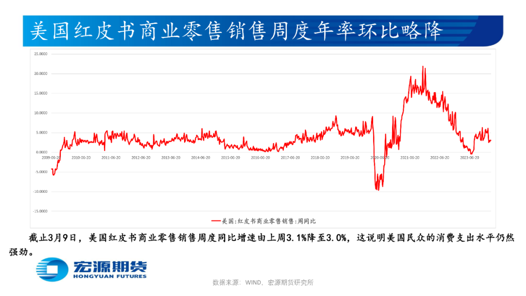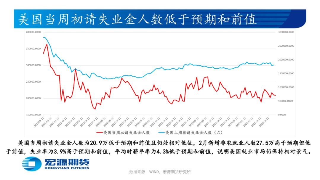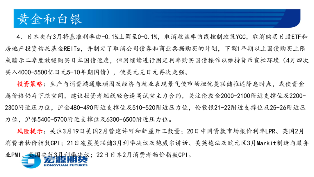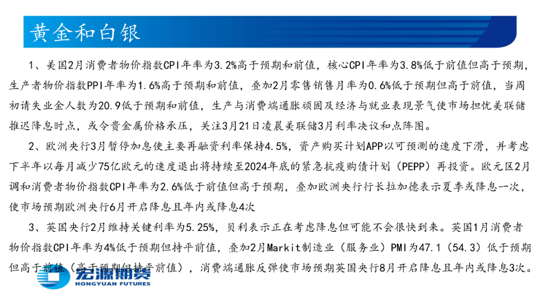 美国2月消费者物价指数CPI年率为3.2%高于预期和前值,核心CPI年率为3.8%低于前值但高于预期,生产者物价指数PPI年率为1.6%高于预期和前值,叠加2月零售销售月率为0.6%低于预期但高于前值,当周初请失业金人数为20.9低于预期和前值,生产与消费端通胀顽固及经济与就业表现景气使市场担忧美联储推迟降息时点,或令贵金属价格承压,关注3月21日凌晨美联储3月利率决议和点阵图。