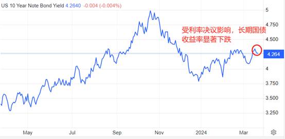 国债市场来看,长短其国债收益率的倒挂临界期限仍然在三个月之六个月间,意味着美联储最早的降息时间点在今年6月份,最晚不会超过9月份。美联储宣布利率决议结果后,十年期美债收益率从高点4.34%下跌至当前4.264%,短期遇阻回落概率较高。技术角度看,去年末至今的美债收益率上行,符合中短期反弹的基本特征。在遇到中期阻力之后,行情将重归主流的下跌趋势。目前看来,中期阻力的出现时间点就在6月份之前。或者说,当非农就业报告、CPI等数据显示美国的宏观经济有硬着陆风险后,中期阻力即可出现。