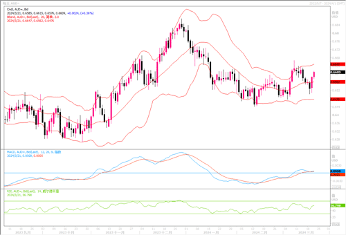周三(3月20日),美联储周三决定维持利率不变,同时维持今年三次降息的预测,而且主席鲍威尔对通胀发表的讲话令人放心,这平息了投资者对利率的担忧,并提振了风险情绪。为此,隔夜纽约盘中,澳元/美元上涨0.85%,高收盘于0.6585。至于澳联储的降息预期又没有变化将取决于周四将公布的澳洲就业数据,分析师预计继连续两个月表现疲软后,2月就业人口增幅将反弹到至少4万人。如果就业数据增幅可观,那么将会令澳联储进一步延缓降息,且降息幅度也将被预期减少。在这种局面下,澳元或许能获得些支撑而回升。日线图上,澳元/美元再度回升至布林带通道中轨线之上,显示澳元抄底买盘较为踊跃,目前在0.6500附近的支撑较为坚实。上方只有穿越此前的高位阻力0.6630,或许才能看到较明显的上升轨迹。