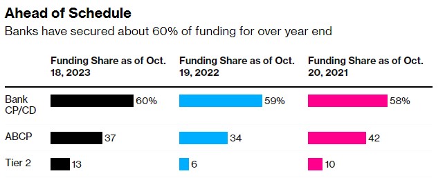 摩根大通策略师也承认,在年底前获得融资方面,大多数在商业票据市场融资的公司都高于通常的水平。策略师们估计,约60%的银行商业票据和定期存单要到2024年才到期,这一比例高于过去几年的水平。此外,资产支持商业票据的发行人在今年年初到期的未偿债务中占37%,高于2022年同期。与过去两年相比,二级发行人(短期信用评级较低的公司)在年底获得融资方面也遥遥领先。但策略师们估计,银行仍有大约5700亿美元的无担保商业票据和定期存单需要展期至2024年,其中近一半集中在日本、加拿大和法国的银行。