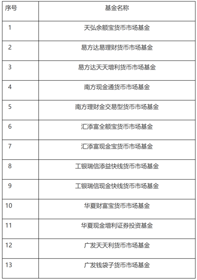 备注:13只货币市场基金产品为,天弘余额宝货币市场基金、易方达易理财货币市场基金、易方达天天增利货币市场基金、南方现金通货币市场基金、南方理财金交易型货币市场基金、汇添富全额宝货币市场基金、汇添富现金宝货币市场基金、工银瑞信添益快线货币市场基金、工银瑞信现金快线货币市场基金、华夏财富宝货币市场基金、华夏现金增利证券投资基金、广发天天利货币市场基金、广发钱袋子货币市场基金。