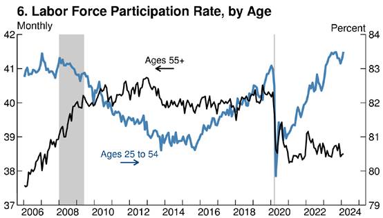 对于促进就业来说,美国的最新失业率为3.9%,国际公认的自然失业率标准为4~6%,美国的失业率数据处于标准之下,意味着劳动力市场处于健康状态。实际上,3.9%的失业率,处于有数据记录以来的底部区域。上图为“按照年龄段划分的美国劳动力参与率”曲线。可以看出,经过2020~22的大流行影响后,25~54岁的就业人群的劳动参与率显著升高,从81%以下上升至83%以上。相反55岁以上的就业人群的劳动参与率显著下降,从82%以上下降至81%以下。55岁以上的就业人群,往往存在健康问题,大流行之后退出劳动力市场符合预期。对于25~54岁的劳动人群来说,劳动参与率的提高,意味着当前美国的就业市场比较火热。正是给予对劳动力市场的乐观判断,Cook才会得出“谨慎放松货币政策”的结论,因为旺盛的劳动力需求,往往导致较高的潜在通胀率。