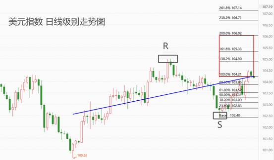 上图为美元指数的日线级别走势图。技术角度看,美元指数处于稳步上涨波段中,下方支撑位102.4,上方第一阻力位104.9,第二阻力位105.33。市价已经与蓝色回归线重合,昨日和今日的两根小阴线表明回归线对市价造成压力。不过,以当前稳定上涨的趋势来看,美元指数继续走强并触及第一阻力位的概率更高。