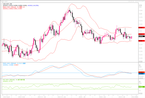 周五(3月29日),美国公布的2月核心PCE同比增速放缓至2.8%,符合预期,也是近三年的最低水平。在数据之后,美联储主席鲍威尔发表讲话表示在没看到通胀切实回落目标范围内之前,美联储不能急切降息。但就其讲话的整体内容来看,市场人士认为,鲍威尔的言论暗示美联储依然坚持通胀将在年内下降至2%的目标,同时也没有改变有关今年降息的预期。对于美国周五的数据以及鲍威尔讲话如何做出如何反映,还有待本周一市场重新开市后加以观察。日线图上,澳元/美元继续维持在布林带通道中轨线与下轨线之间(0.6560-0.6470之间)横盘震荡之中。技术指标略偏于下摆,显示澳元略偏于弱势。若澳元/美元跌穿很盘低位支撑0.6470,下行将变得明显。只有重返0.6560之上,弱势状态方有望得以改善。