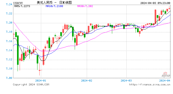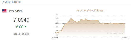 4月3日,人民币中间价报7.0949,上调8点,上一交易日中间价报7.0957。