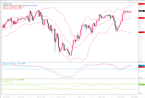 周一(4月1日),美元周一上涨,美元/日元周一尾盘报151.63。周一当日供应管理协会(ISM)称,美国制造业生产3月反弹,新订单增加,但工厂就业依然低迷,投入价格上涨。制造业占美国经济总量的10.4%,制造业反弹,终结了连续16个月萎缩的颓势。为此,市场周一下调了对美联储6月降息的押注。结合周五的PCE数据,市场再次开始微调对今年降息频率和时间的预期,美元指数也是因之维持上涨的表现。至于日元,日本对日元的行动计划仍然难以预测。由于财政年度已经结束,日本央行不必担心日元的突然波动会影响资产负债表。因此可能会扩大容忍日元贬值的空间。但上周日本三大货币当局财务省、日本央行和金融厅召开紧急会议的消息以及官员们认为汇率波动剧烈情况下将施以干预的评论,迄今仍使日元维持在34年低点之上。日线图上,布林带通道喇叭口有开始扩大之像,若152心里阻力关口被突破,美元/日元上升将会加速。