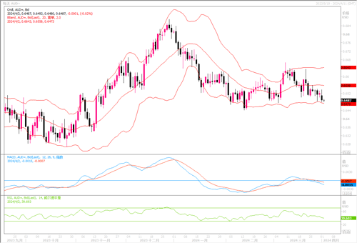 周一(4月1日),澳元/美元下跌,最新报0.6488。上周五以及本周一,美国连续公布的经济数据显示美国经济增长的步伐仍显稳健、通胀率增长温和具有反复性,从而降低了年内降息幅度预期,促使美元继续相对其他主要非美货币保持着利率差优势和汇率走强的表现。叠加近期铁矿石价格下滑,澳元/美元是持续的回落之中。日线图上,澳元/美元逐渐往布林带通道下轨线滑落,技术指标明显下摆,显示澳元偏向于弱势。一旦跌穿今年2月份的最低点0.6450的支撑,澳元/美元恐怕将形成明显的下跌通道。目前上方靠近布林带通道中轨线0.6550附近是初步的阻力水平所在。