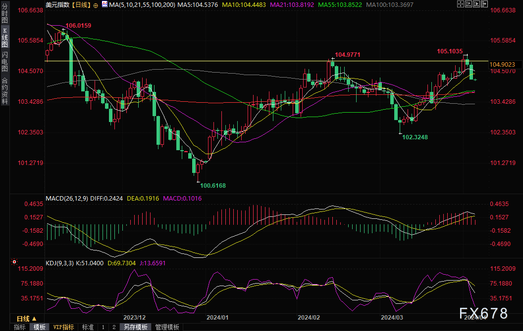 周四(4月4日)亚市早盘,美元指数维持弱势,目前交投于104.22附近。