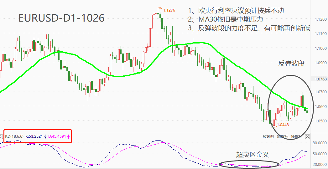 技术角度看,EURUSD仍处于显著空头趋势,MA30均线一直对跌势起到保护作用。10月4日开始启动反弹,10月23日长阳线突破MA30压制,出现空转多的迹象,但隔天出现长阴线,将阳线取得的突破效果全部抹杀,之后的连续两根小阴线将市价拉回到MA30之下,预计本轮反弹失败,不就将可能创出新低。震荡指标KD的读数处于中间区域,8月29日至10月4日,连续形成超卖区间的黄金交叉,为后续的反弹做了充分铺垫,但最终的反弹仍然不及预期。综合来看,多数技术指标指向EURUSD空头延续。