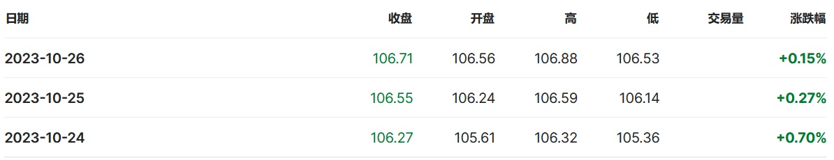 受美债收益率走高和强劲的美国经济数据推动,衡量兑六种主要货币的一篮子美元指数(DXY)持续走高。截至发稿,美元指数涨0.15%,报106.71,接近10月初创下的年内高点。