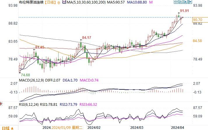 北京时间4月9日11:20布伦特原油连续报90.70美元/桶