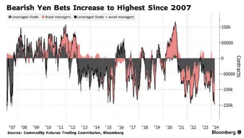 当前,日元遭遇做空的程度已经堪比金融危机前夕。据美国商品期货交易委员会发布的最新数据,在截至4月2日的一周内,全球对冲基金和资产管理公司持有的日元空头净额升至148388份,为2007年1月以来的最高水平。