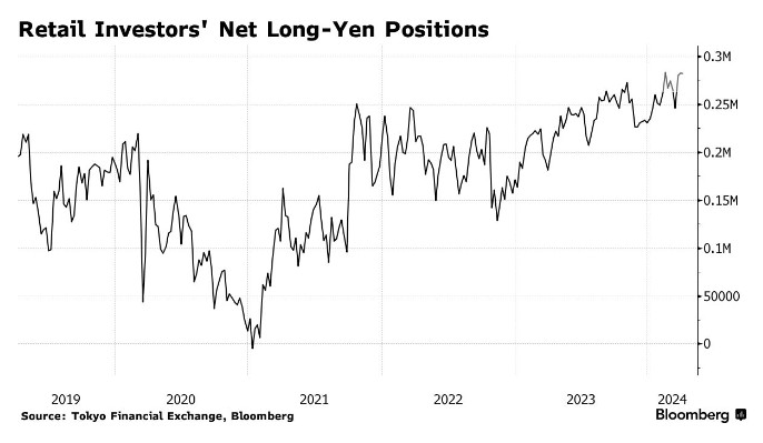 根据日本央行的数据,日本占全球散户外汇交易的近30%。根据东京金融交易所Click365的交易所外汇保证金交易(FX)市场,日本散户投资者持有的日元多头头寸在4月2日接近创纪录水平。