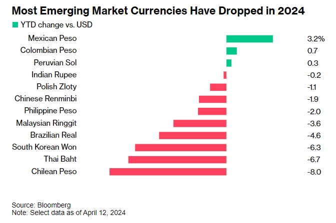 上周,美国通胀数据高于预期,抑制了对美联储降息的押注,这表明对抗美元走强的战斗不会很快结束。与此同时,以色列和伊朗之间日益加剧的中东紧张局势也有可能引发对美元避险需求的新一轮飙升。