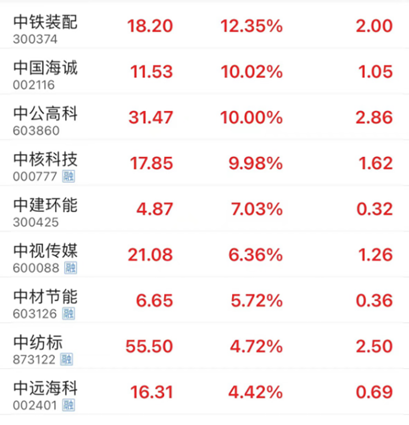 早盘,以央国企为主的“中字头”股票继续活跃,午前涨幅有所回落。截至午间收盘,中铁装配涨超10%,中公高科、中核科技、中国海诚涨停,中建环能(300425)、中视传媒(600088)、中材节能(603126)等涨超5%。