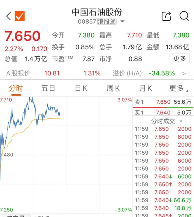 中国石油盘中最大涨幅超3%,总市值一度重回2万亿元。截至午间收盘,中国石油报10.81元,涨1.31%,最新总市值1.98万亿元。
