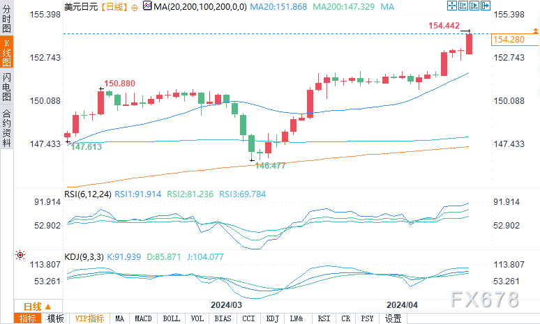 周一(4月15日)北京时间23:06,美元/日元报154.279/290,涨幅0.65。