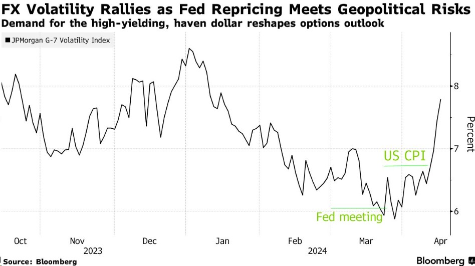 外汇市场的波动性正在飙升,交易员们押注中东地缘政治紧张局势加剧以及美国高于预期的通胀将推高美元。
