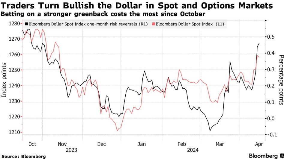 衡量未来一个月主要货币对冲波动的指标已跃升至1月以来的最高水平。最新一轮波动是由伊朗对以色列的攻击引发的。在此之前,美国上周公布的强劲通胀数据引发了人们的猜测,即美联储将不得不在更长时间内保持货币紧缩政策。