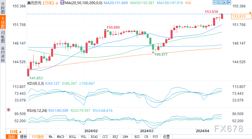美元/日元汇率涨至154,创下34年来新高,并继续面临美元走强的压力。美国顽固的通胀引发了人们对美联储将在更长时间内维持高利率的担忧。
