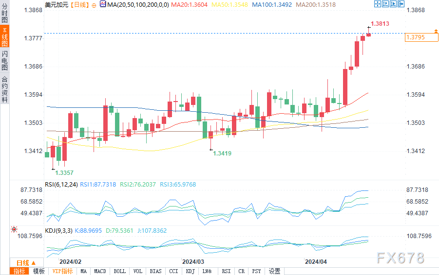 2天RSI在日线图已经超买了四天,看涨的可能越来越小。加拿大的CPI数据和来自中东的总体风险可能会在短期内左右市场。但价格可能正在接近拐点。