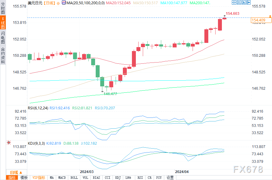 北京时间15:03,欧元/美元报1.0614/15,跌幅0.08%。美元/日元报154.429/440,涨幅0.11%。英镑/美元报1.2436/37,跌幅0.07%。