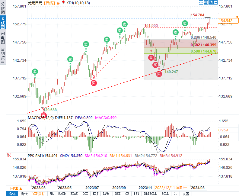 美元兑日元的汇率在周三的最新交易中达到154.63,接近34年来的低位。今年以来,美元兑日元的汇率已经下跌了约9%。由于美元兑日元汇率逐渐接近155日元,市场担忧可能会引发日本当局的干预。然而,有观点认为,即使进行干预,也无法改变日美利率差的经济基本面,因此可能无法阻止日元的贬值。