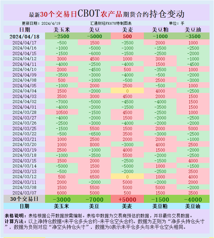 根据汇通财经观察,海外交易商估算的结果显示,本周四(4月18日),大宗商品基金增加CBOT美豆、美豆粕、美豆油、美玉米投机性净空头头寸,增加美麦投机性净多头头寸。最新30个交易日,大宗商品基金增加美麦投机性净多头头寸,增加美豆、美豆油、美豆粕、美玉米投机性净空头头寸。