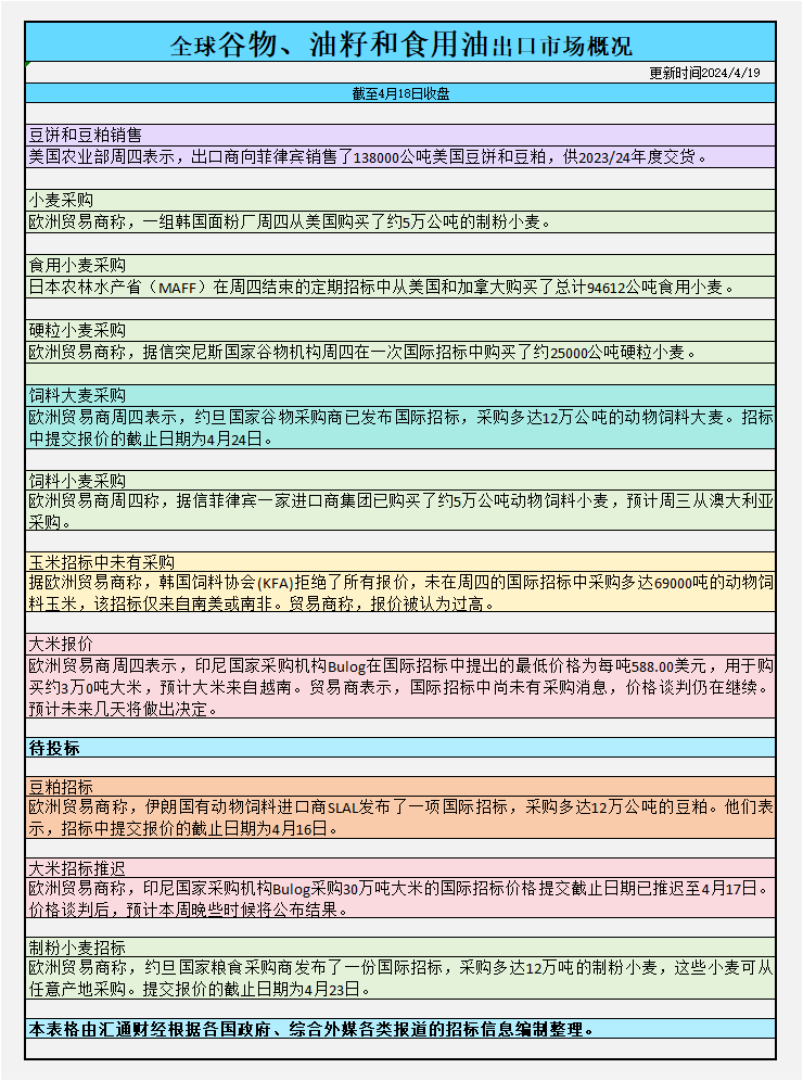 截至周四收盘,全球谷物、油籽和食用油出口市场招标、采购概况