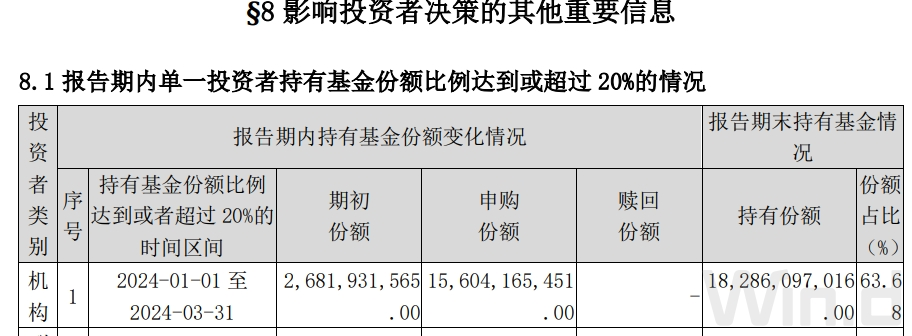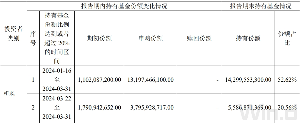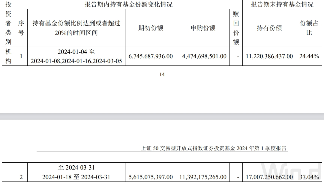进入今年第一季度,尽管报告中并未直接提及中央汇金,但数据显示,“机构1”和“机构2”在报告期初合计持有的份额恰好也是123.6亿份,与中央汇金上一年度年末的持仓份额相符。这一细节表明,“机构1”和“机构2”很可能是中央汇金或其关联实体。