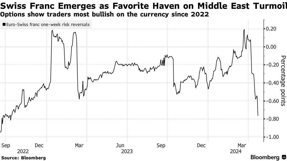 期权市场也突显出投资者的避险情绪。风险逆转指标(市场仓位和人气的晴雨表)显示,交易员看好瑞士法郎兑欧元的程度是2022年底以来最高的,对下周日元兑美元走强的期权需求也升至去年7月以来最高水平。