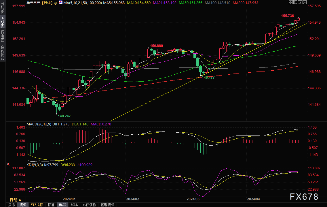 汇通财经APP讯——周四(4月25日)亚洲时段,美元兑日元持续走高,一度刷新1990年以来高点至155.73,日本财务省并未在汇率突破155.00时采取行动,市场看起来并非“无序”。汇率走高也是基于“基本面”--美债收益率坚挺、美国经济强劲,后者是否成立取决于今晚和明天的关键美国数据。