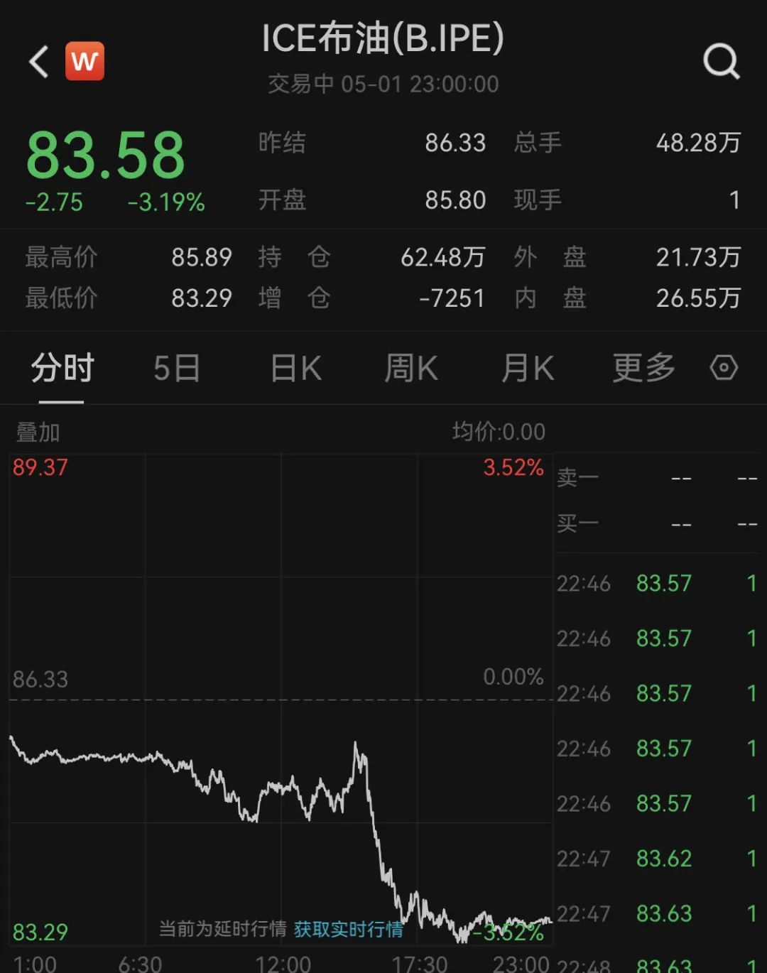 不过,国际油价全线下跌,美油6月合约跌3.42%,报79.13美元/桶。布油7月合约跌3.19%,报83.58美元/桶。