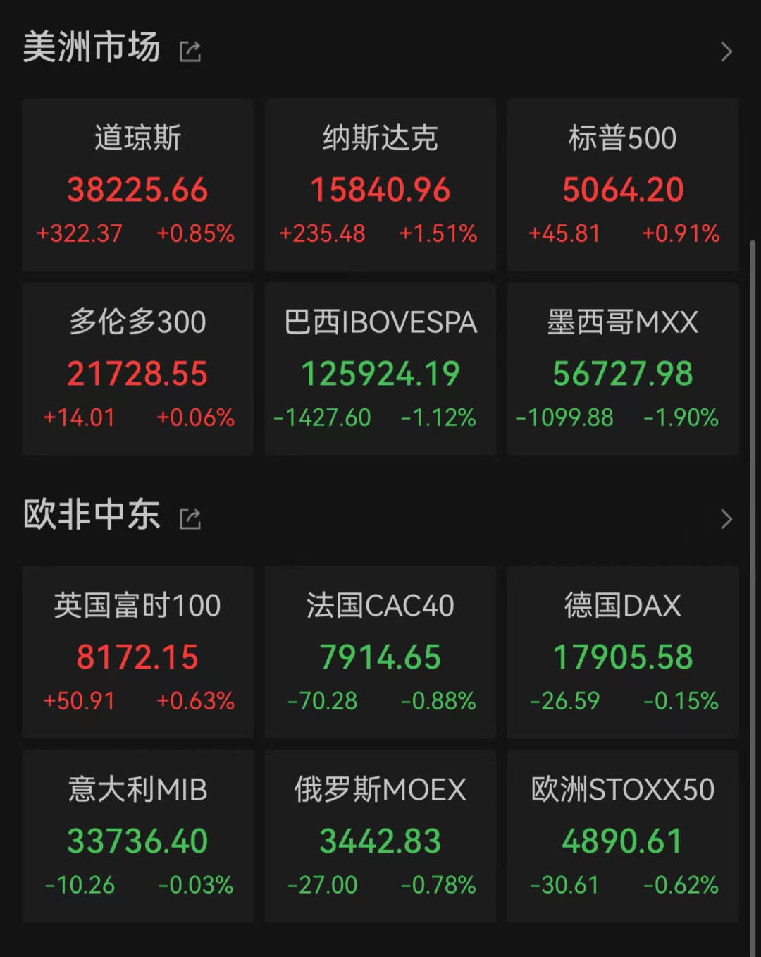 美股市场三大指数全线上涨,道琼斯工业指数、纳斯达克指数、标普500指数分别上涨0.85%、1.51%、0.91%。