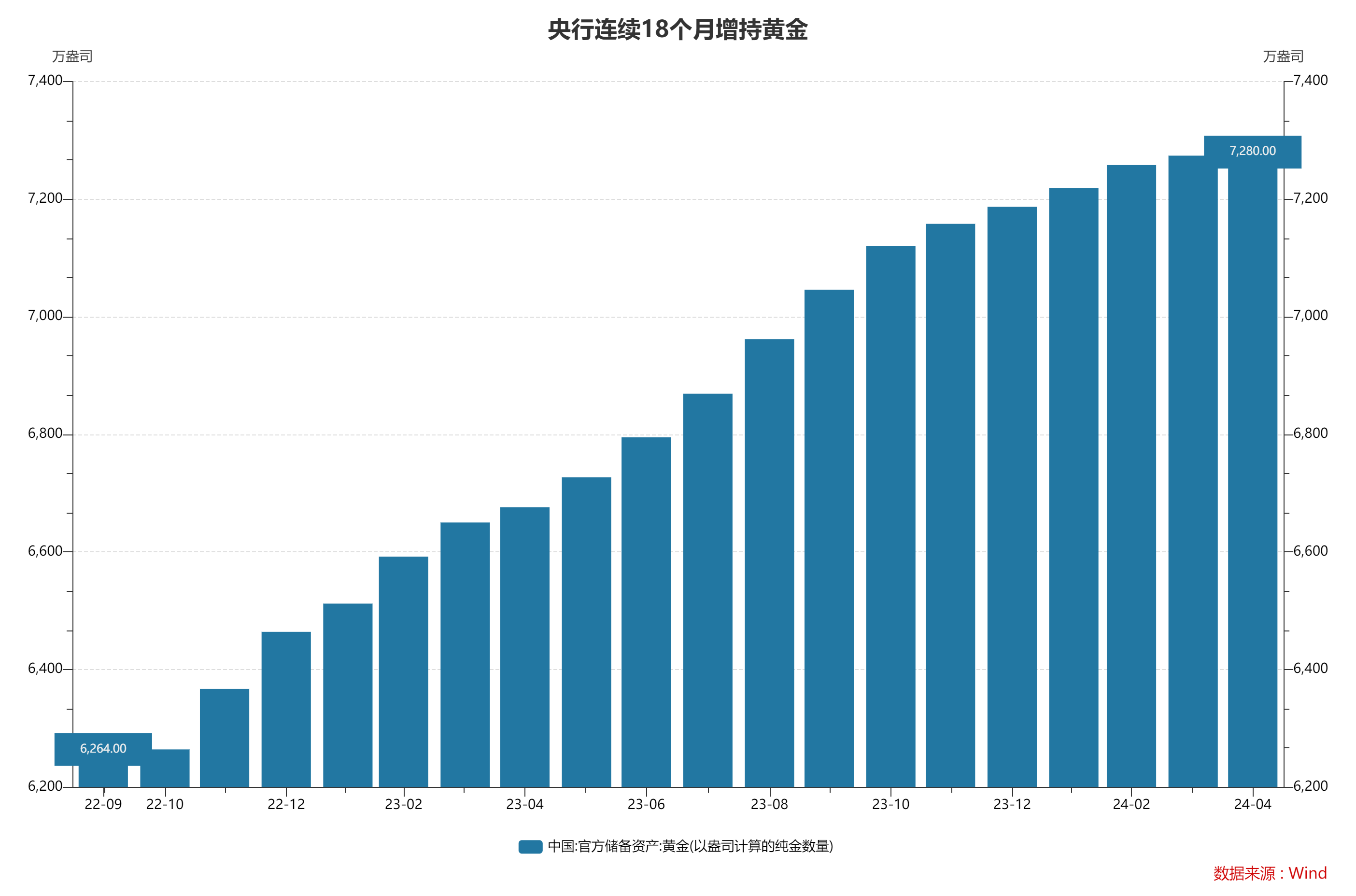 黄金作为重要的储备资产之一,已获央行连续18个月增持。截至4月末,黄金储备报7280万盎司,3月末为7274万盎司,环比上升6万盎司。