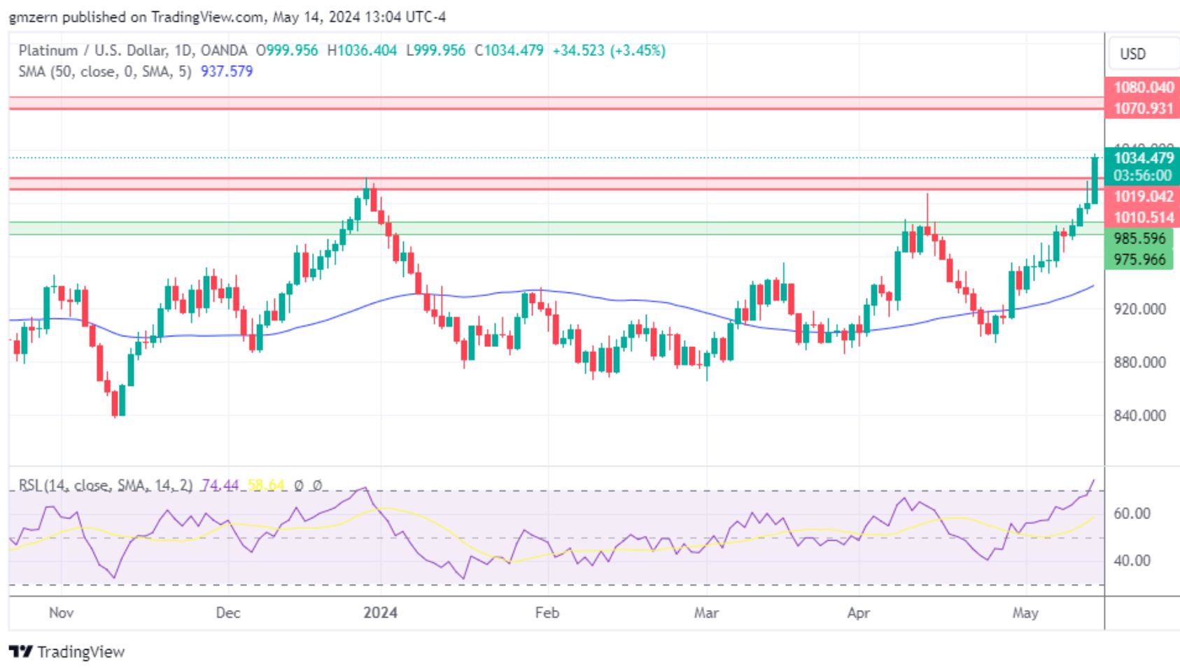 如果铂金保持在1010美元至1020美元的阻力位以上,将朝着1070美元至1080美元的下一个阻力位发展。