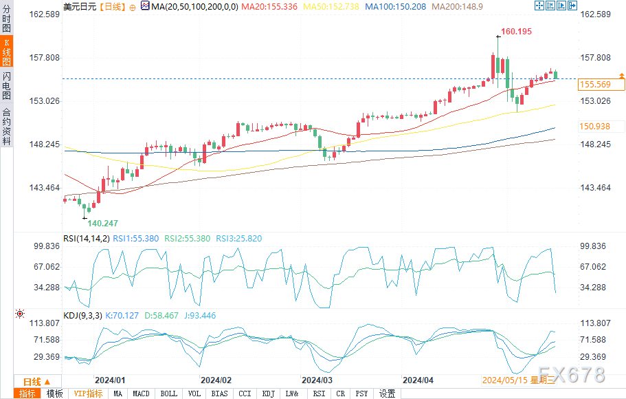汇通财经APP讯——周三(5月15日)欧盘时段,在重要数据出炉前,美元/日元维持下跌。盘中报155.692,跌幅0.45%。