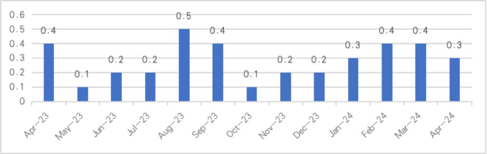 如图所示,美国月度通胀变化趋势减弱。与3月相比,4月食品(占指数权重的13.421%,以下相同)价格变化由3月的0.1%降至4月0%,其中粮食类(8.085%)、牛奶(0.730%)、水果蔬菜(1.395%)和其他食品(2.171%)分别跌0.2%、0.7%、0.8%、0.2%;能源服务(3.139%)跌0.7%;除食品外的其它商品中,新车(3.618%)和二手车(1.918%)价格延续了3月的下跌趋势,4月又分别跌了0.4%、1.4%。在剔除能源服务的其他服务中,医疗服务(6.496%)和交通服务(6.481%)价格涨势放缓,医疗服务价格涨势由3月的0.6%降至4月的0.4%,交通服务则由1.5%降至0.9%。