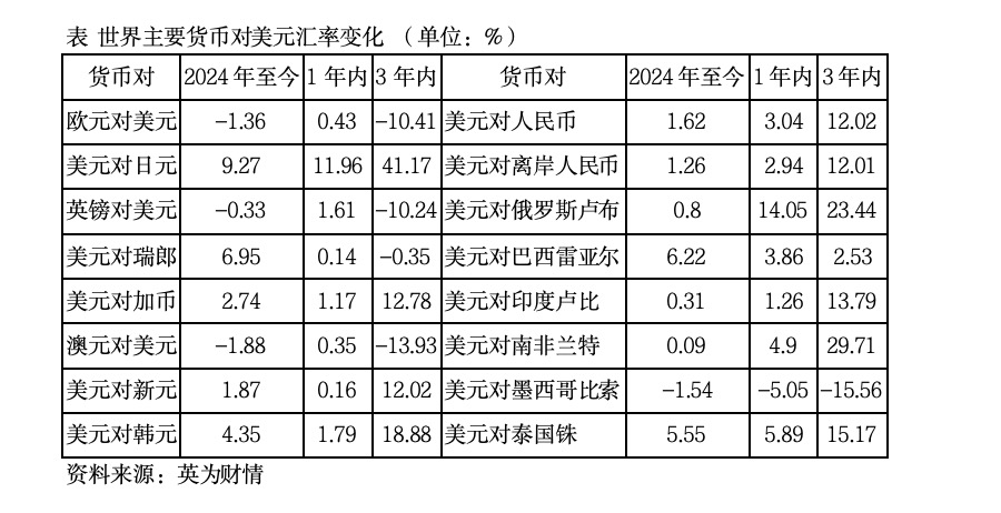 自美联储于2022年3月加息以来,世界主要中央银行大致可分为两类:紧跟美联储脚步;根据本国国情自主决定货币政策。前者以欧洲和加拿大央行居多,后者多为新兴市场经济体国家。就一年以内看,欧元对美元、英镑对美元、美元对瑞郎(瑞士法郎)、美元对加元、澳元对美元和美元对新元(新加坡元)汇率变化较小,而美元对日元、美元对人民币、美元对俄罗斯卢布、美元对巴西雷亚尔、美元对南非兰特、美元对泰国铢汇率贬值幅度较大。从三年来看,美元高利率对几乎所有货币均产生了较大的贬值压力。