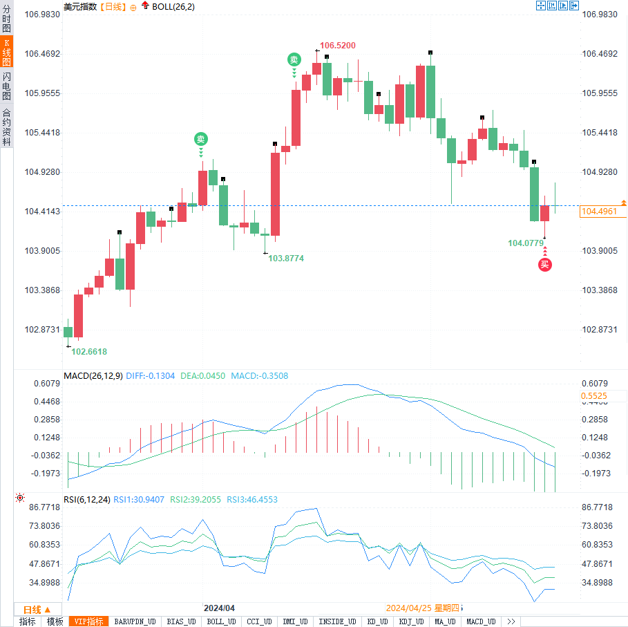 本周,美元经历了一段波动的旅程。美元指数在104.49附近维持疲软,最终以一波回跌结束了本周的行情,周线下跌0.79%。尽管市场对美国经济实现软着陆抱有希望,但美联储官员的谨慎态度以及对通胀阻击战进展的担忧,限制了美元的跌幅。此外,美国10年期和2年期国债收益率的V型走势,也反映了市场对未来利率走向的不确定性。